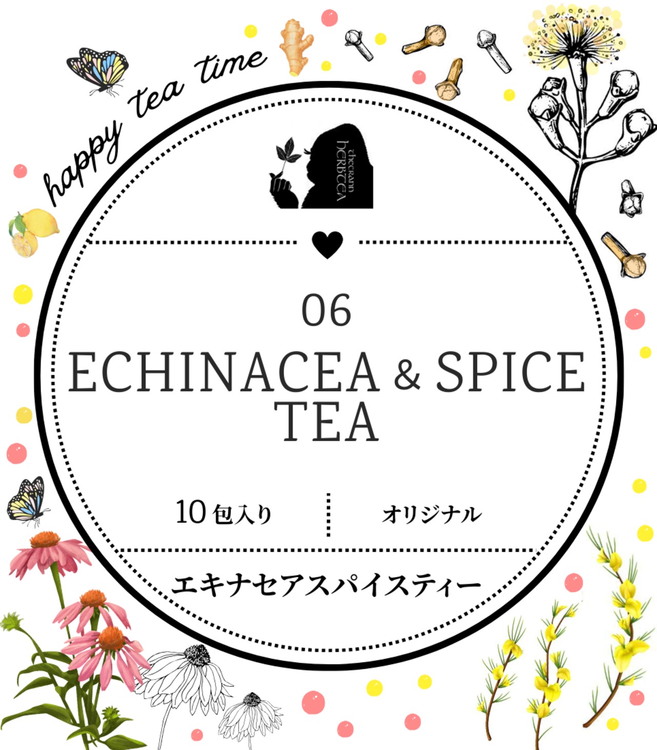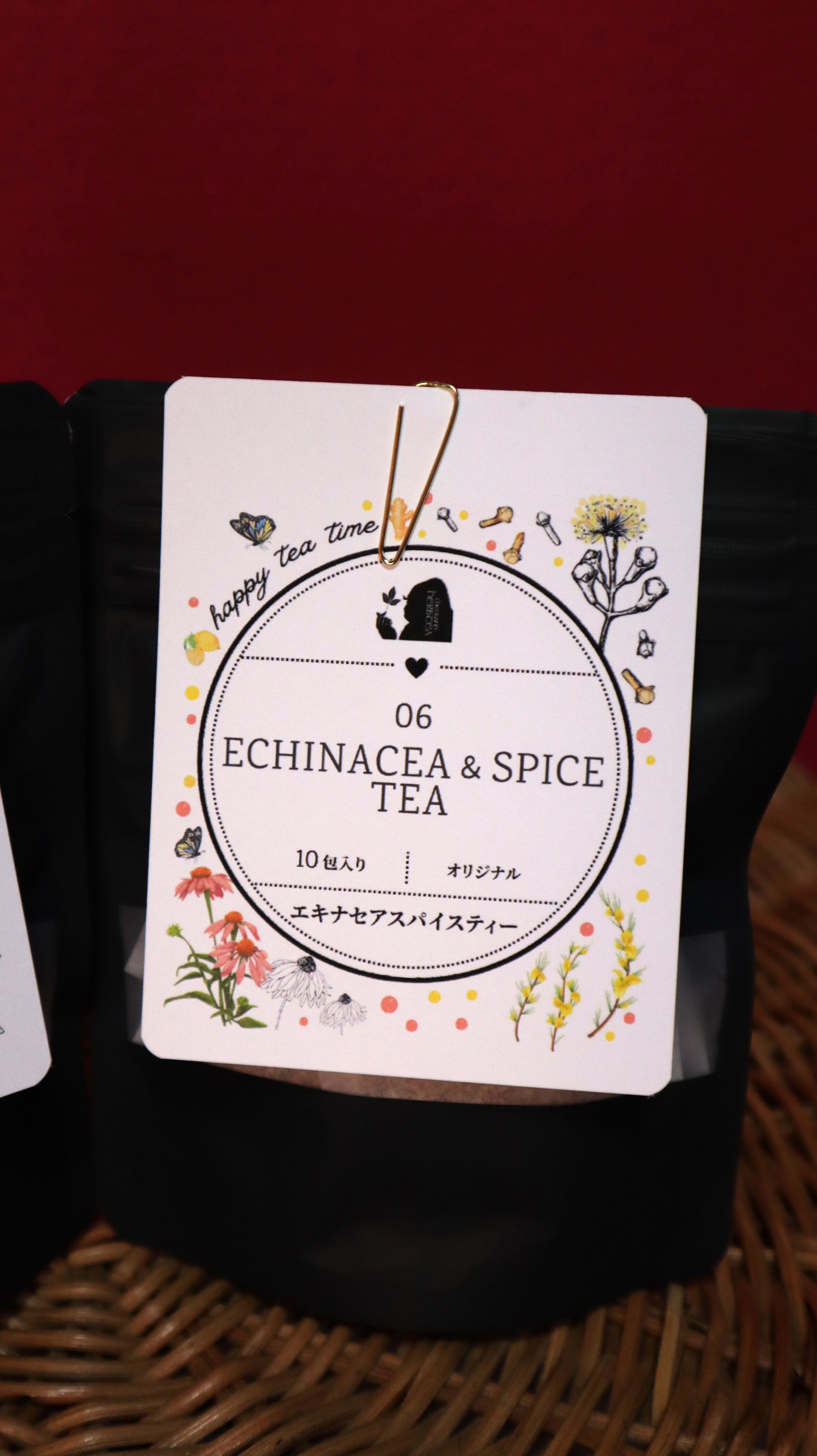 エキナセア、グリーンルイボス、アップルフルーツ、ナツメグ、クローブ、ジンジャー、レモンピール、ハイビスカスがブレンドされたスパイスたっぷりのハーブティーです。
